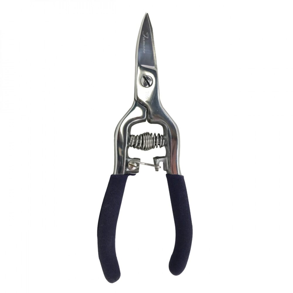 Famore heavy duty German stainless steel; 55 to 58 Rockwell hardness. 2-1/4in blade length and a serrated bottom blade. This ergonomic scissor is great for the heavier fabrics used in home decor drapery and upholstery. Squeeze the comfort foam grip spring lock and the scissor will open by itself.