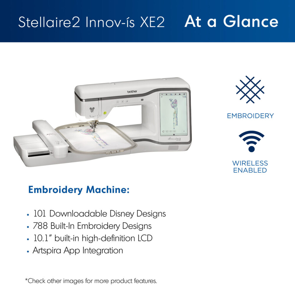The modern Stellaire2 Innov-ís XE2 Embroidery Only Machine with Disney continues the Brother legacy of exceptional embroidery machines. With 788 embroidery designs, plus 101 Disney exclusive designs (for a total of 889), a large 9.5” x 14” embroidery area, and wireless integration with Artspira, the Stellaire2 Innov-ís XE2 will elevate your embroidery skills.