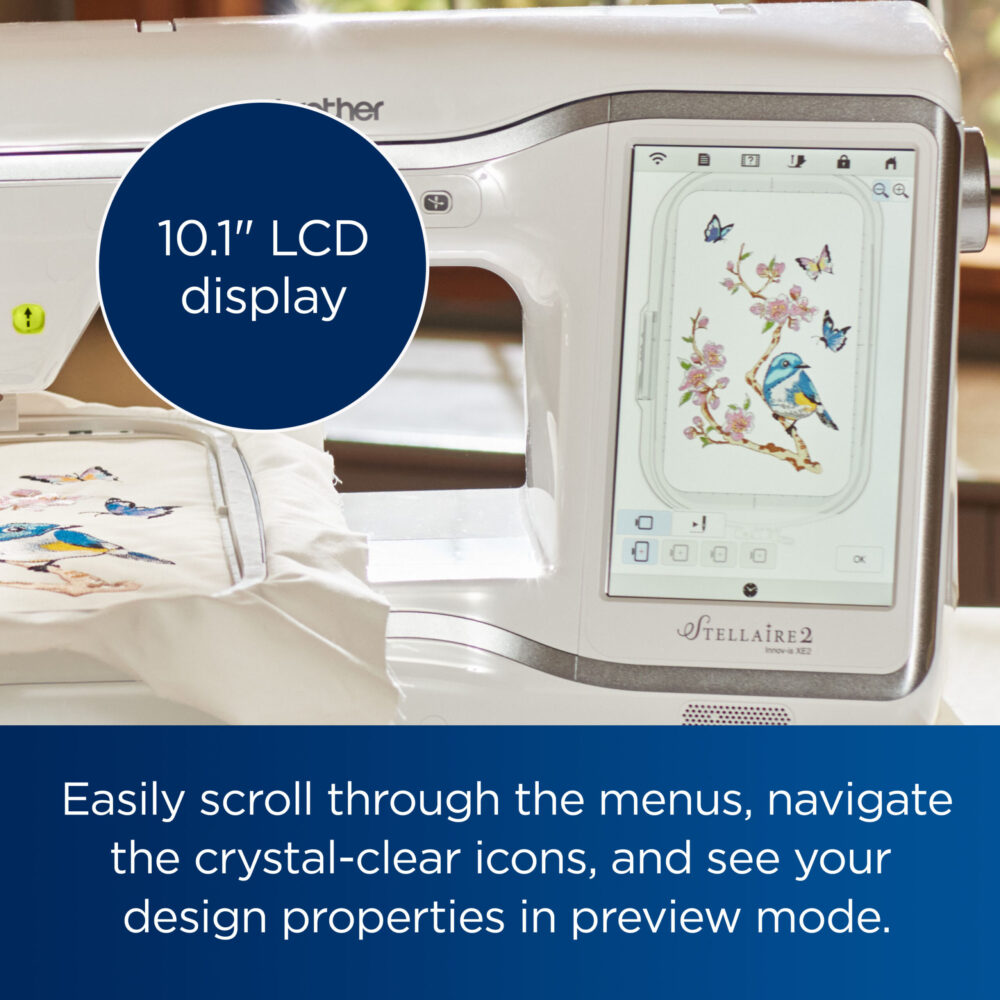 - LCD Display- See your designs come to life on the large 10.1" built-in high-definition LCD display and easily scroll through the menus, navigate the crystal-clear icons, and see your design properties in preview mode. You can also watch one of the many educational tutorial videos so you can get the most of your Stellaire2 XE2 embroidery experience.