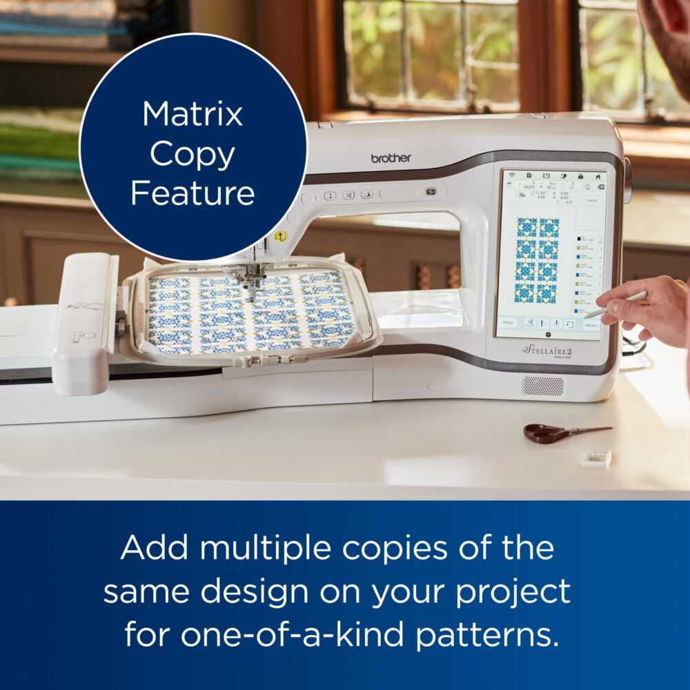 - Matrix Copy Function- Create unique and distinctive designs with the Matrix Copy feature. Add multiple copies of the same design on your project for one-of-a-kind patterns.