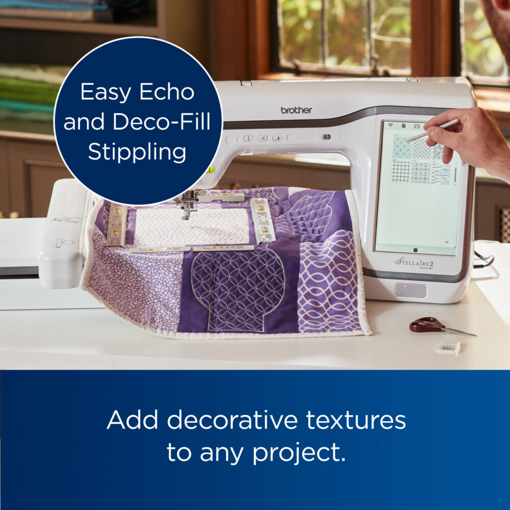 - Embroidery Positioning Function- Enjoy innovative embroidery features on the Stellaire2 with the time-saving 2-point positioning with LED pointer which will help you align designs for pin-point embroidery placement.