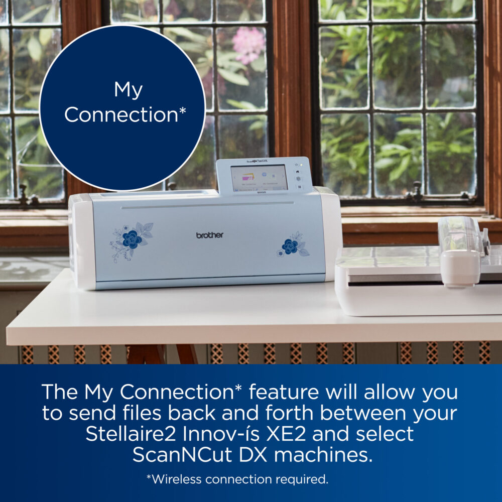- My Connection- The value-packed My Connection feature will allow you to send files back and forth between your Stellaire2 Innov-ís XE2 and select ScanNCut DX machines. When the design or pattern is sent from machines when connected to the same wireless network, the ScanNCut DX to a Stellaire2 Innov-ís XE2, it can be retrieved in My Design Center. This feature takes the place of using a USB to transfer designs between machines and is exclusive to ScanNCut DX machines only.