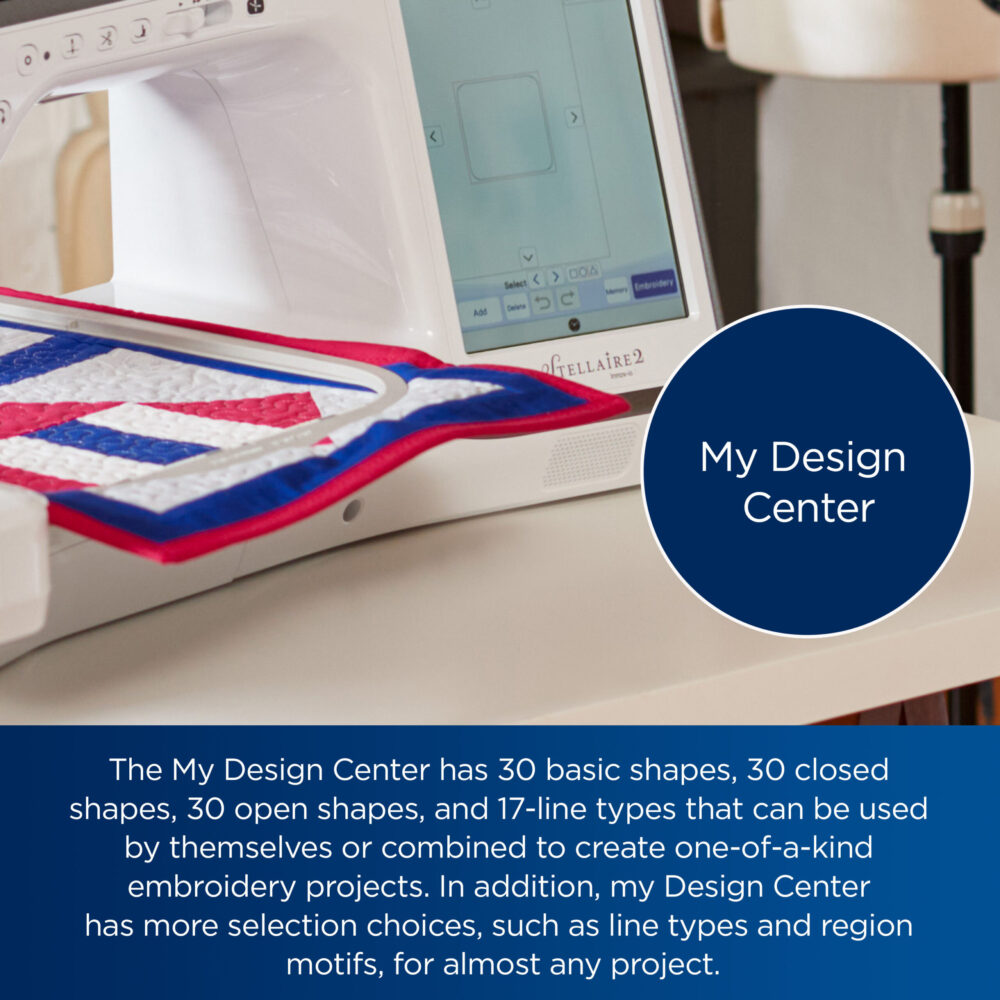 - My Design Center- The My Design Center has 30 basic shapes, 30 closed shapes, 30 open shapes, and 17-line types that can be used, alone or combined, to create unique embroidery projects. In addition, my Design Center has more selection choices, such as line types and region motifs, for almost any project.