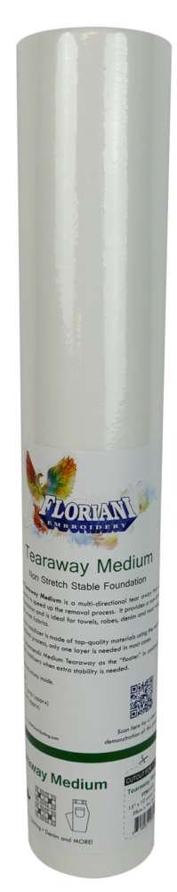 Floriani Medium Tearaway is manufactured using a unique process called the “Delta Wet Laid Non-Woven” technique. The benefit of using this method of production is that the product is very solid, when closely examined you will see no thick and/or thin spots. When used as an embroidery stabilizer, it is not necessary to use multiple layers in random directions to support stitches. Medium Tearaway is a 1.5 oz, clean tear stabilizer. It is the best choice for a supplement stabilizer when working on high stitch count designs in conjunction with your other stabilizers such as No Show Nylon Mesh, Heat N Sta Tearaway or Wet N Stick. It provides back up support without adding unwanted bulk.