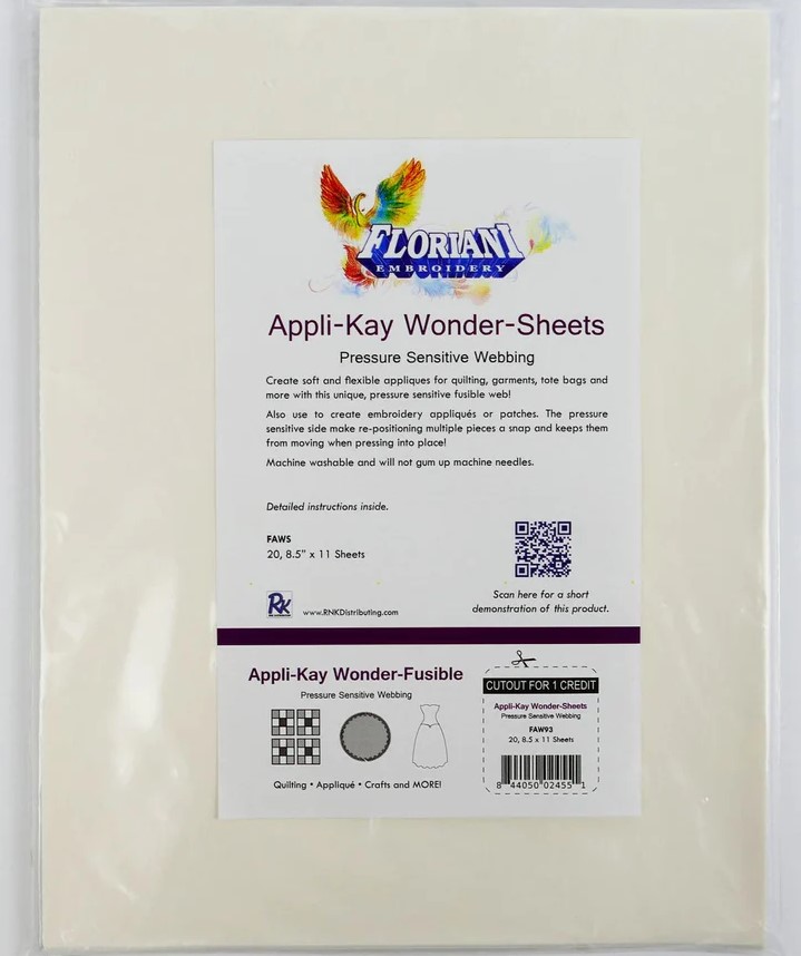 Floriani Appli-kay Wonder is a specialized webbing material which is fusible on one side and sticky on the other! Use for traditional or machine embroidered appliqué to hold pieces in place while you stitch without gummy needles! Enjoy the soft and flexible texture of Appli-kay Wonder when layering pieces. The pressure sensitive side makes positioning small detailed pieces a snap! Also use to hold free standing embroideries or patches in place while you stitch.