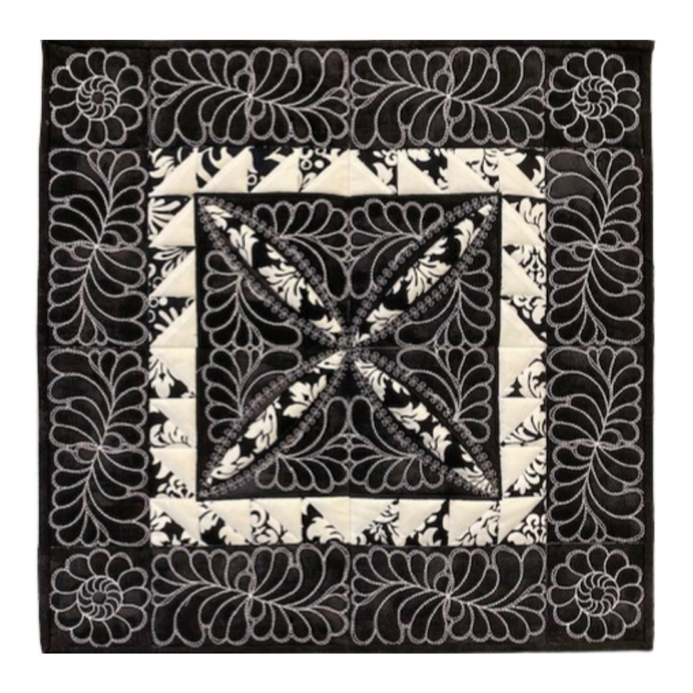 The feather quilted border completes the look. Only three fabrics are required to create this elegant design.
