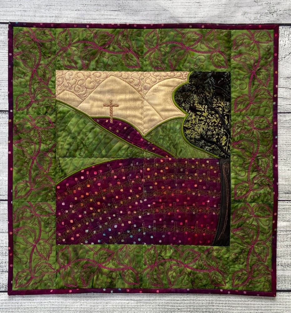 Beautiful vine boarder surrounds a vineyard hillside landscape with a beautiful tree and cross. The cross is the last step and optional. It can be left off.