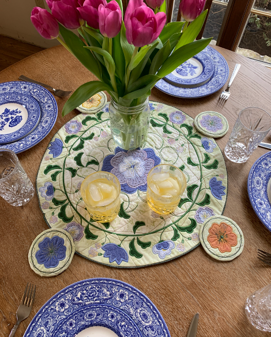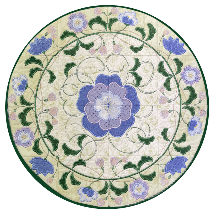 In Bloom features a vine meandering along the edges with stunning floral and leaf applique. The center includes a striking applique flower with beautifully quilted vines. Embroidered flowers complement the applique and add a charming touch to this table topper. Make ‘In Bloom’ in it’s original layout for a round dining table or add on blocks to create a longer table topper, perfect for a rectangular dining tables.