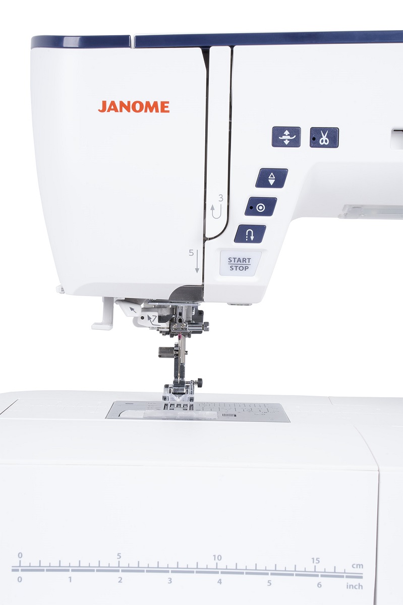 - Buttons: Start/Stop, Reverse, Lock stitch, Needle up/down, Automatic presser foot lift, Automatic thread cutter
