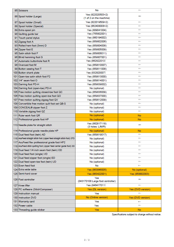 - Sewing feet: Zigzag foot A, Overedge foot M, Rolled hem foot D, Zipper foot E, Satin stitch foot F, Open-toe satin stitch foot F2, Blind hemming foot G, 1/4" seam foot O, Darning foot PD-H, Automatic buttonhole foot R with stabilizer plate, Button sewing foot T, Button shank plate, Dual feed foot AD (twin), AcuFeed FlexTM
