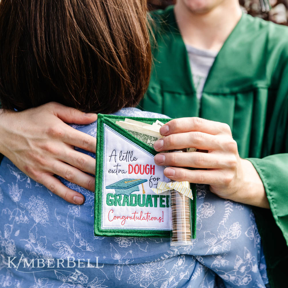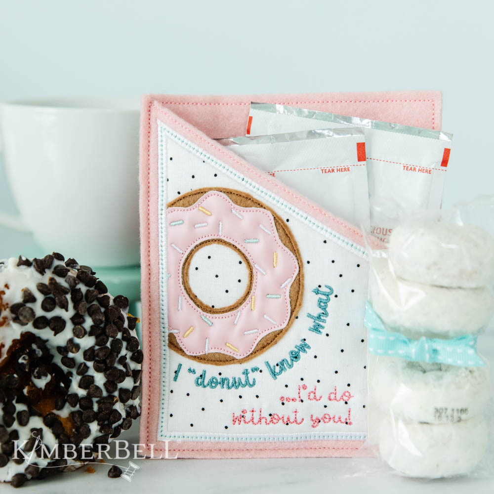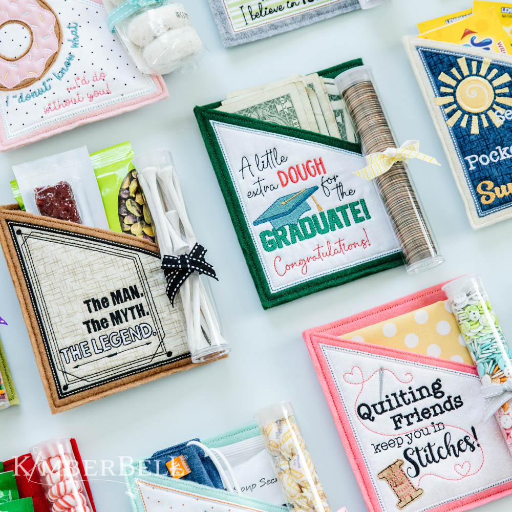 Share kindness and smiles with Kimberbell Heart-Felt Gift Pockets! Made completely in a 5×7 hoop, these giftable pockets are perfect for Just Popping By with a Pocketful of Sunshine. Cheer a Tough Cookie who’s Under the Weather, give Extra Dough to a graduate, create Fabulous Birthday presents, and more! Choose from 12 darling designs for a variety of occasions, then attach a Kimberbell Sweet Tube and fill with treats, gift cards, and other fun surprises. When you Donut Know what to give, Heart-Felt Gift Pockets are a delightful way to brighten a day.