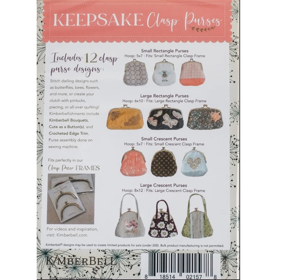 Keepsake Clasp Purses: 12 beautiful bags with pintucks, piecing, or all-over quilting, embroidered with butterflies, bees, flowers, and more. Kimberbellishments include Kimberbell Bouquets, Cute as a Button, and Crocheted Edge Trim. With Keepsake Clasp Purses, style is in the bag!