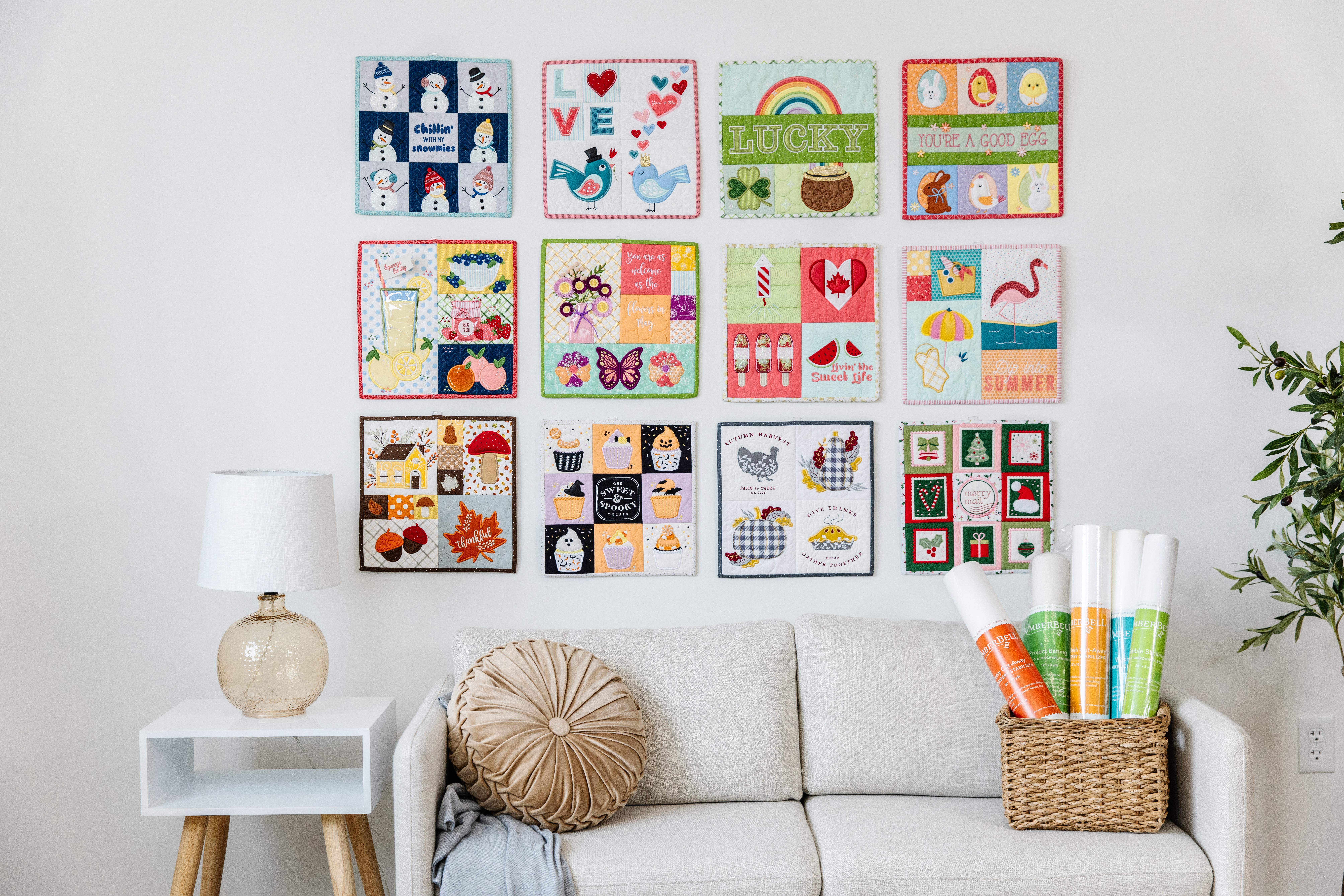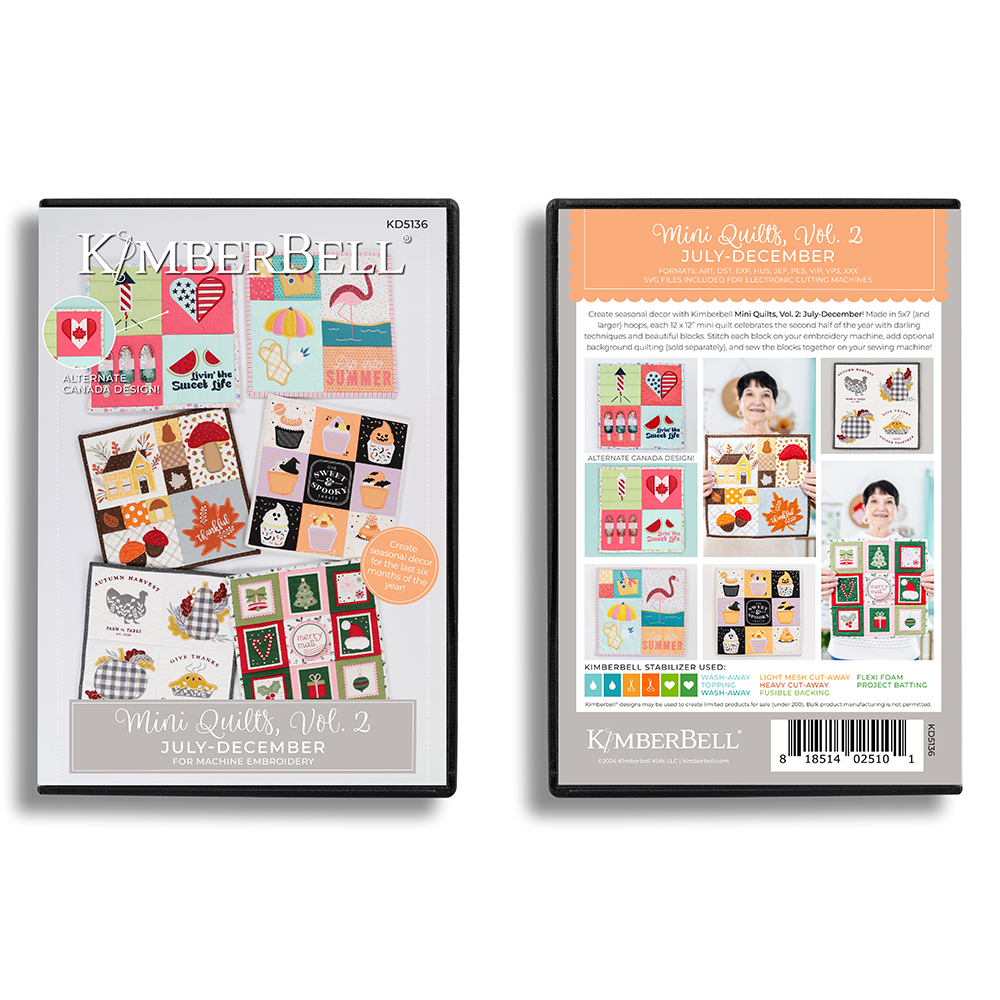 Create seasonal gifts and decor with Kimberbell Mini Quilts, Vol. 2: July-December! Made in 5×7 (and larger) hoops, each 12 x 12” mini quilt celebrates the second half of the year with darling techniques and beautiful blocks. Stitch each block on your embroidery machine, add optional background quilting*, and sew the blocks together on your sewing machine! From summer sun to festive fun, Kimberbell Mini Quilts are always in season.
