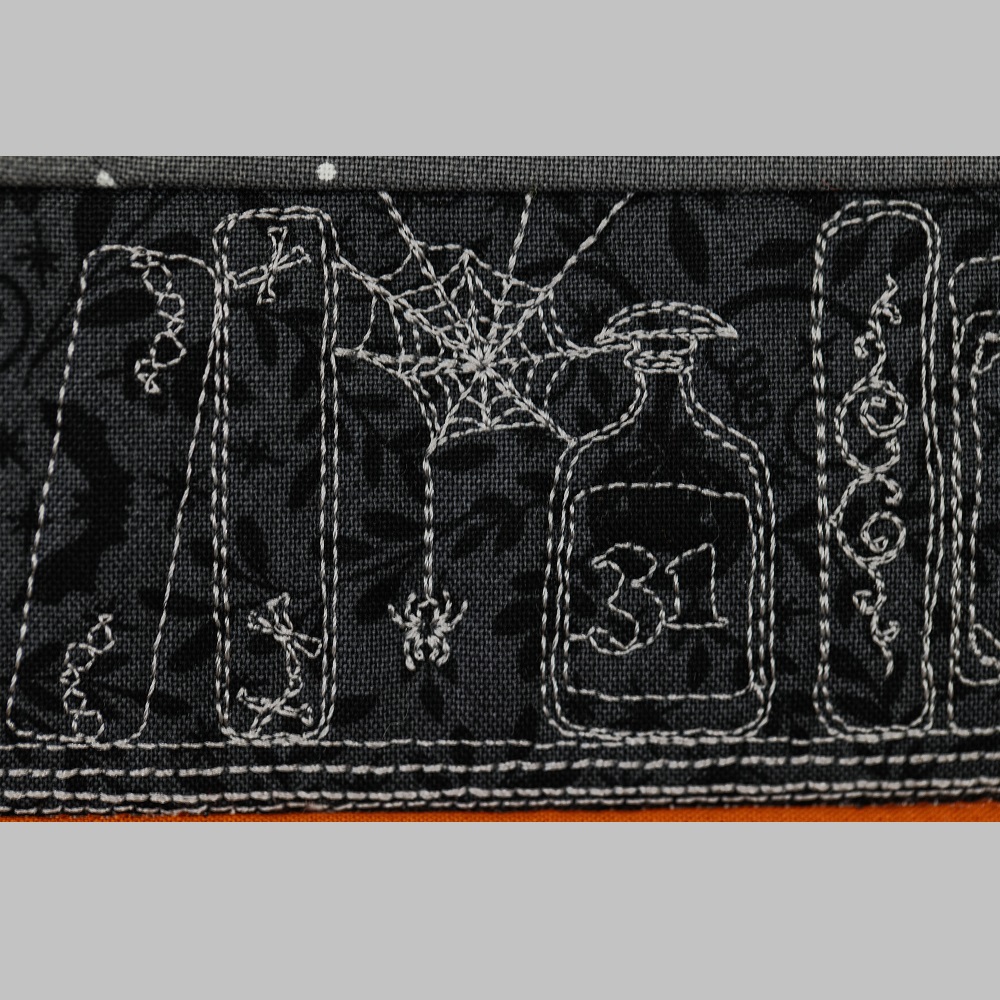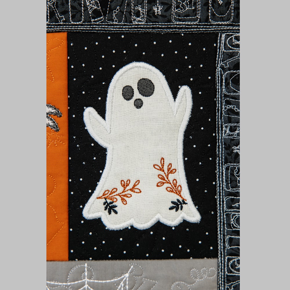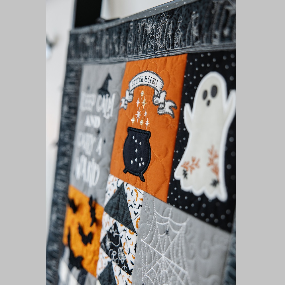 Come stitch a spell with Kimberbell’s Pumpkins & Potions Ladder Quilt! Our enchanting 20″ x 60” quilt features everything you love about Halloween, including ghosts, bats, spiders, and more. Piece plaid blocks in-the-hoop, create dimensional jars with clear vinyl, and adorn your quilt with rhinestones, fairy lights, and other bewitching embellishments! Each boo-tiful block is stitched in a 5″ x 7″ machine embroidery hoop with a variety of charming techniques. From candles and cobwebs to each spooky sentiment, our Pumpkins & Potions Ladder Quilt is sure to raise your “spirits!”