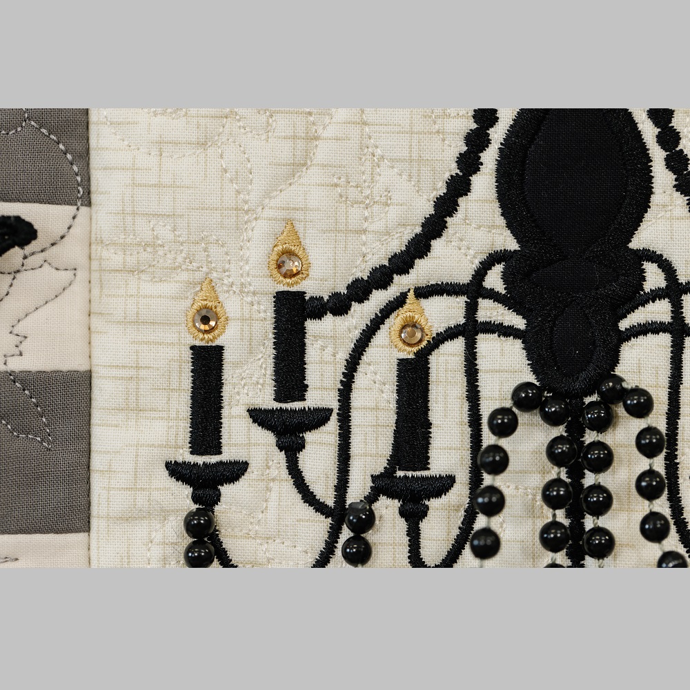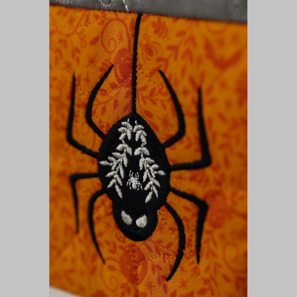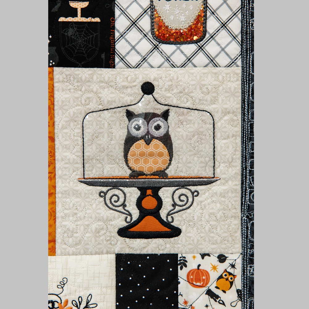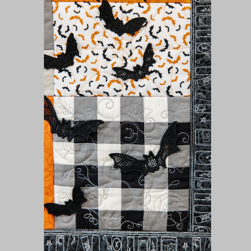 Come stitch a spell with Kimberbell’s Pumpkins & Potions Ladder Quilt! Our enchanting 20″ x 60” quilt features everything you love about Halloween, including ghosts, bats, spiders, and more. Piece plaid blocks in-the-hoop, create dimensional jars with clear vinyl, and adorn your quilt with rhinestones, fairy lights, and other bewitching embellishments! Each boo-tiful block is stitched in a 5″ x 7″ machine embroidery hoop with a variety of charming techniques. From candles and cobwebs to each spooky sentiment, our Pumpkins & Potions Ladder Quilt is sure to raise your “spirits!”