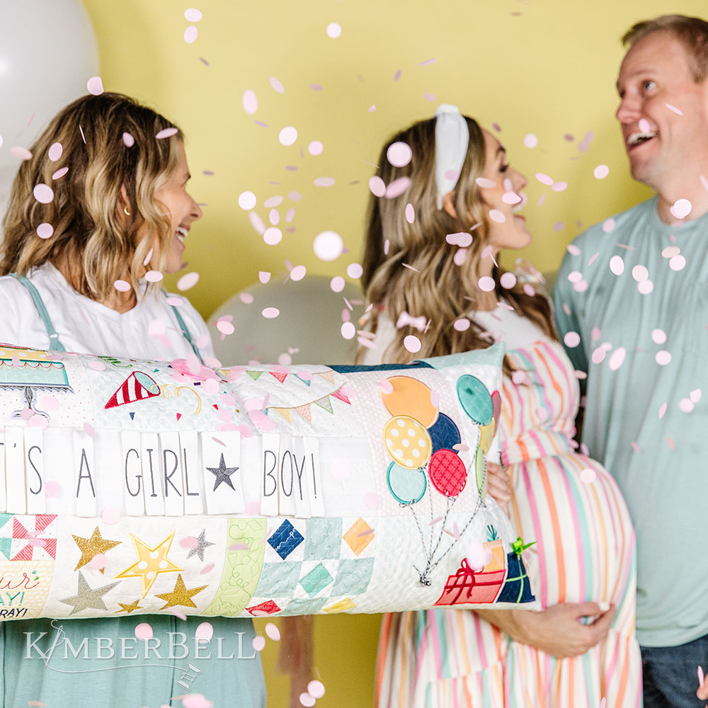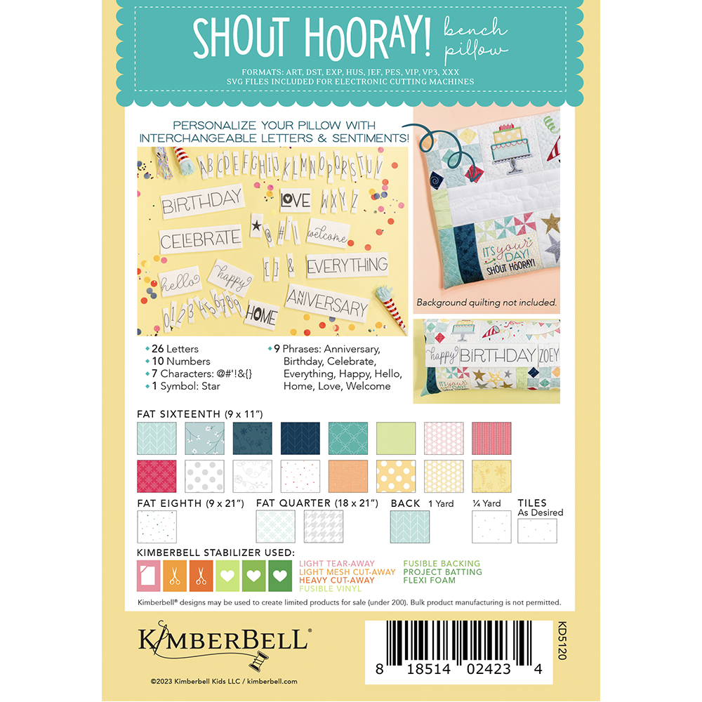 Kimberbell’s Shout Hooray! Bench Pillow celebrates the people you love with confetti, cake, and more! Stitch names, dates, and greetings with our included alphabet and sentiments, then feature your message in our letterboard panel. Add sparkle and shine with a variety of embellishments, then piece your pinwheel and nine-patch blocks right in-the-hoop! With optional background quilting and delightful designs, your Shout Hooray! Bench Pillow is perfect for every special occasion.