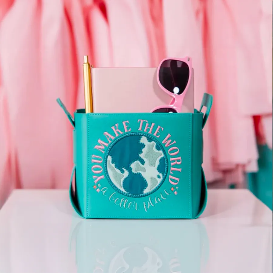 Kimberbell Blanks Turquoise Folding Storage Tote is ideal for showcasing your embroidery, needlework and more. Stitch your design on the included panel then flip and fold to create a roomy tote as easy as 1-2-3.