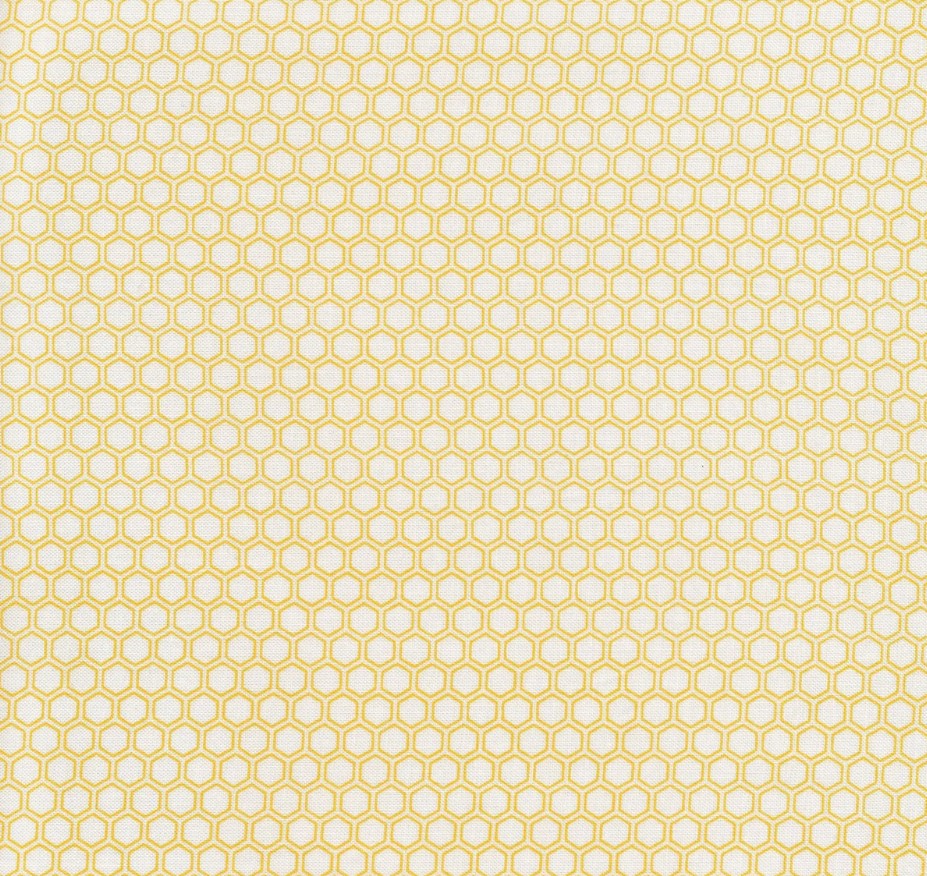 Vintage Flora by Kimberbell Designs for Maywood Studio is a lovely floral collection full of bright beautiful colors and fun designs. Create a geometric project with this fabric featuring yellow hexagon shapes all over a white background.