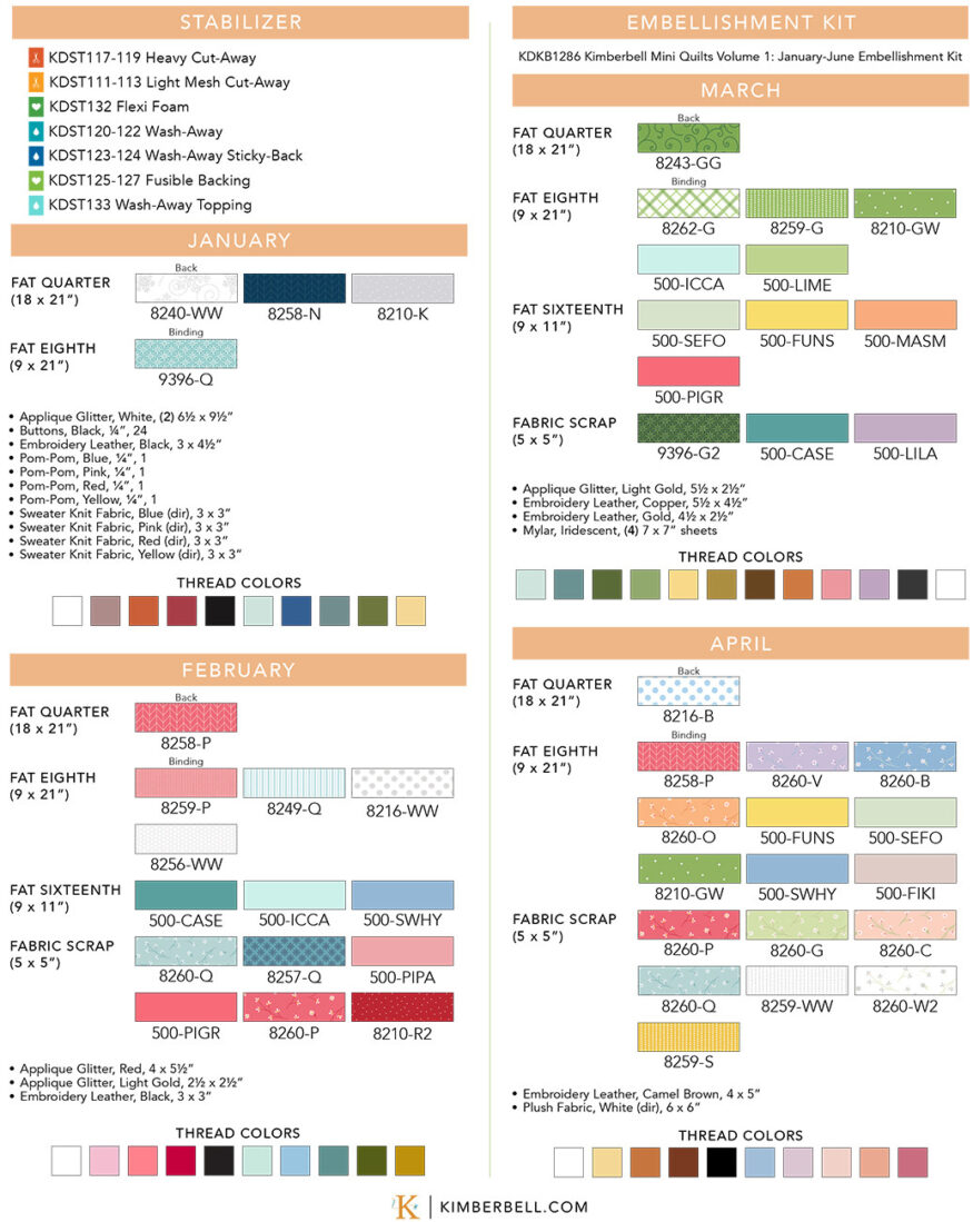 Create seasonal gifts and decor with Kimberbell Mini Quilts, Vol. 1: January-June! Made in 5×7 (and larger) hoops, each 12 x 12” mini quilt celebrates the first half of the year with darling techniques and beautiful blocks. Stitch each block on your embroidery machine, add optional background quilting (sold separately), and sew the blocks together on your sewing machine! From snowmen and shamrocks to lovebirds and more, Kimberbell Mini Quilts are always in season.