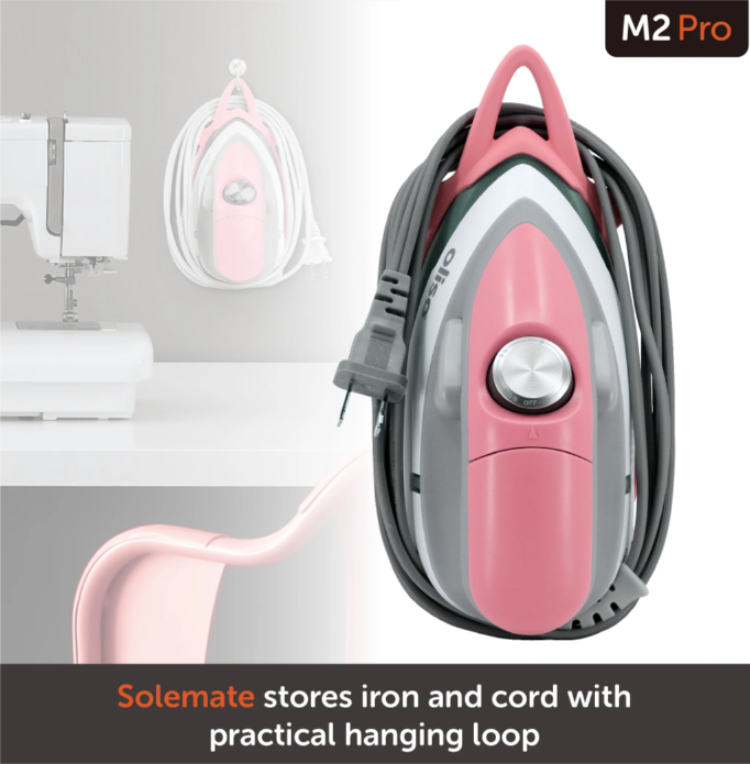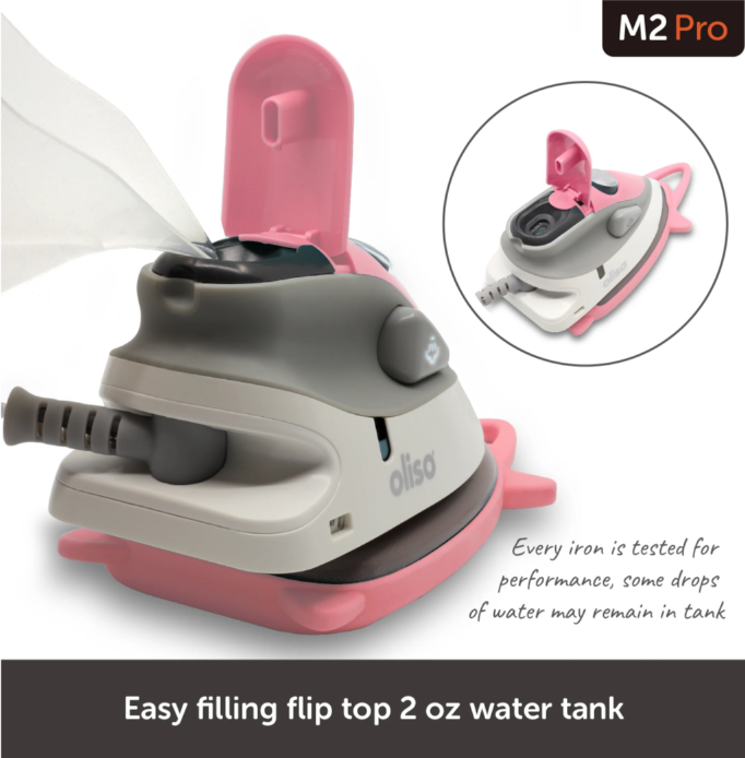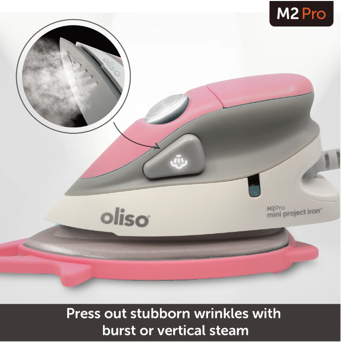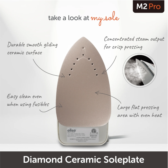 Hello! meet the oliso project iron. Designed just for sewing, quilting + crafting. With the power of a full sized iron in a compact and lightweight design, the oliso project iron fits right next to your sewing machine or in your travel bag. The oliso project iron comes with a solemate so you can leave your oliso project iron in the face down position. The solemate also protects and allows you to store your oliso project iron easily and safely. The oliso project iron fits snugly into the palm of your hand and has been weight-balanced for precision movement and minimal strain on your wrist. It features a Diamond Coated Ceramic sole plate, flat pressing surface, detailer tip, and a 8-foot cord for full range of motion.