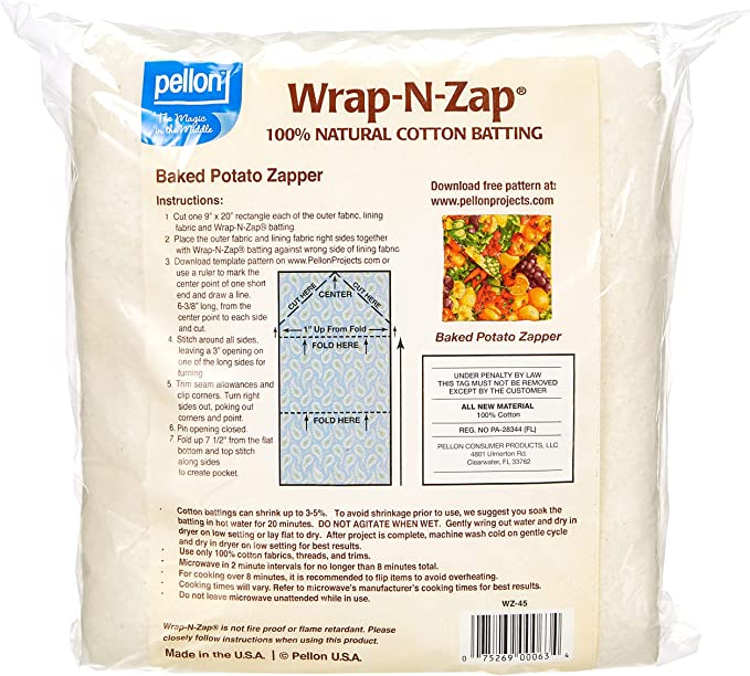 Make steamy potatoes and vegetables with this batting. The 100 percent natural cotton batting is suitable for a variety of microwavable projects. It can be used for things like insulated potato bags or as a casserole warmer. The batting material was designed to retain moisture. When food items are heated with the Wrap N Zap batting it produces steamy potatoes, vegetables and more.