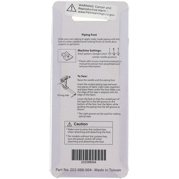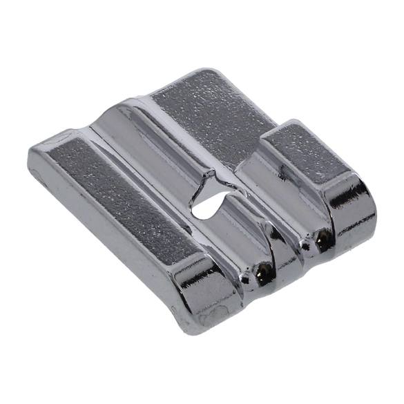 If ready made piping is not available or if you just want to make your own, the piping foot is ideal for the job. The piping foot is designed with two grooves on the underside and will hold and cover the cord when making piping tape. It can also b used for attaching piping. Maximum cord size is 5 mm.