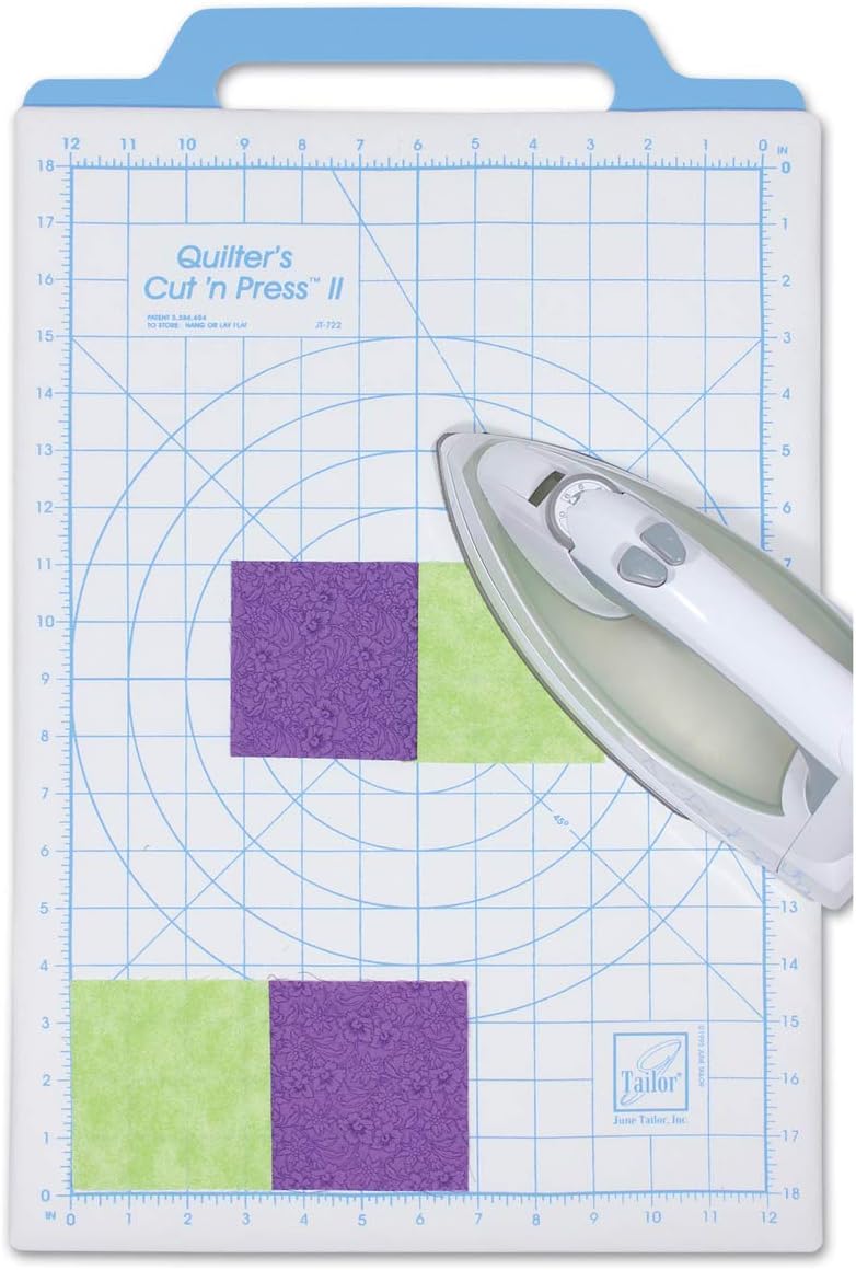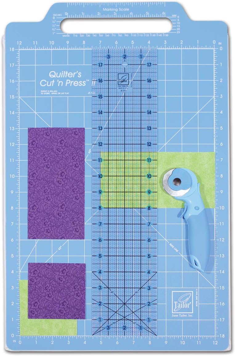 June Tailor® Cut ‘n Pressâ„¢ II offers the best in cutting and pressing surfaces in one convenient tool. Signature hard surface cutting mat on one side for superior durability and extended blade life. Cushioned cotton/poly pressing surface on the other side is perfect to press and square blocks. Size: 12″ x 18″ Grid Key Features: