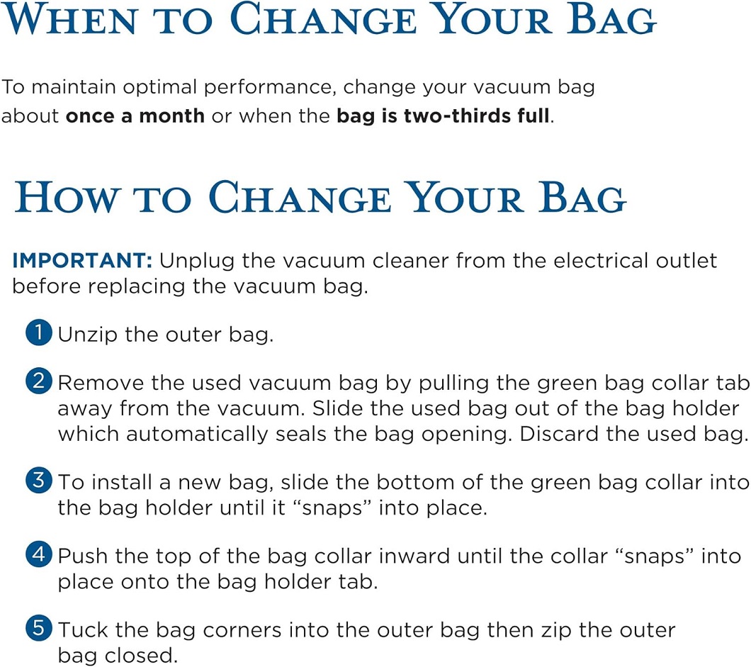 - Replacement: Change vacuum bags regularly to help maintain the high performance of your Riccar cordless vacuum and extend vacuum life; replacing bags is quick and easy; refer to owner’s manual or bag packaging instructions