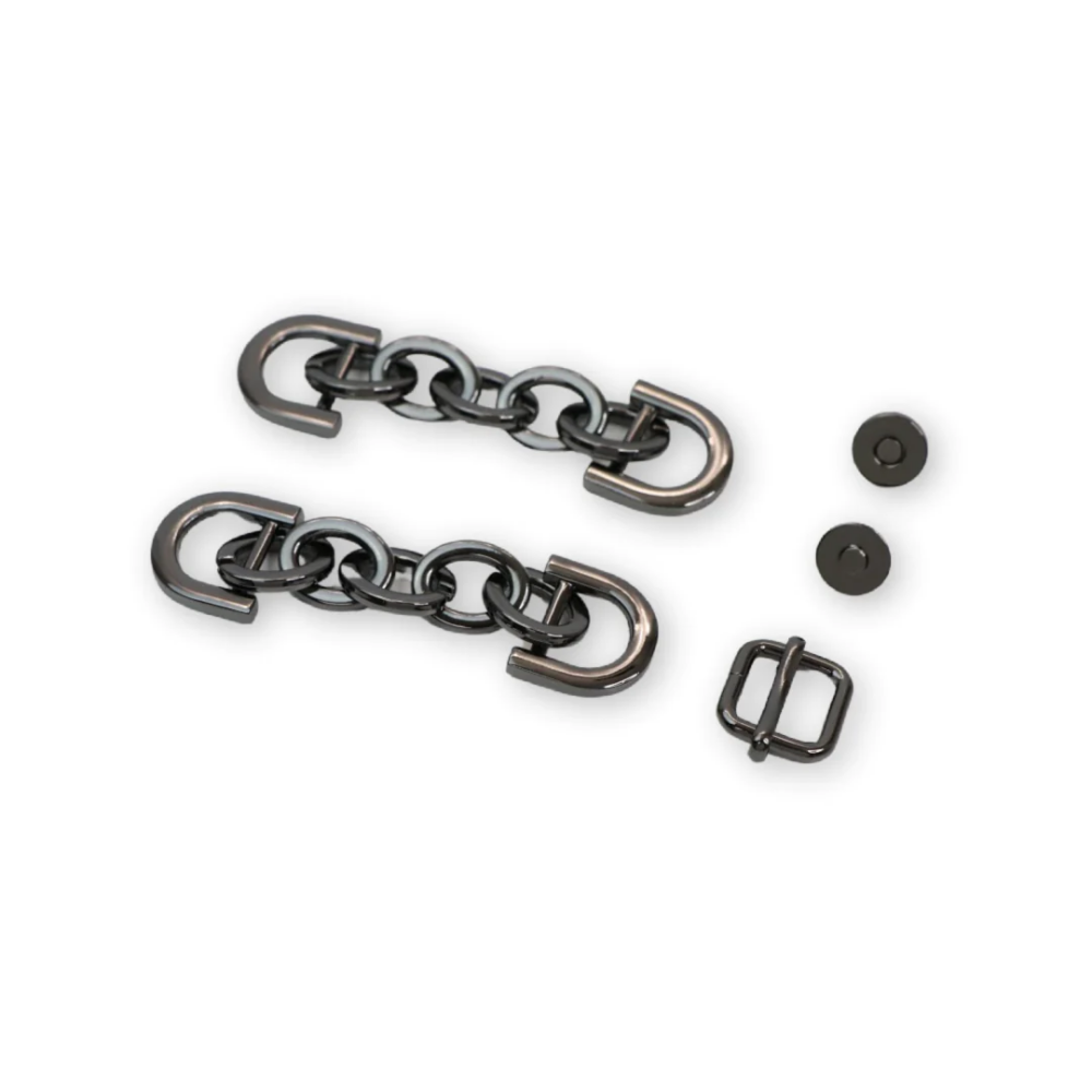 Included in Hardware Kit: (2) 1/2” Chain Strap Connector, (1) 1/2” Slider Buckle, (1) 3/4” Magnetic Snap