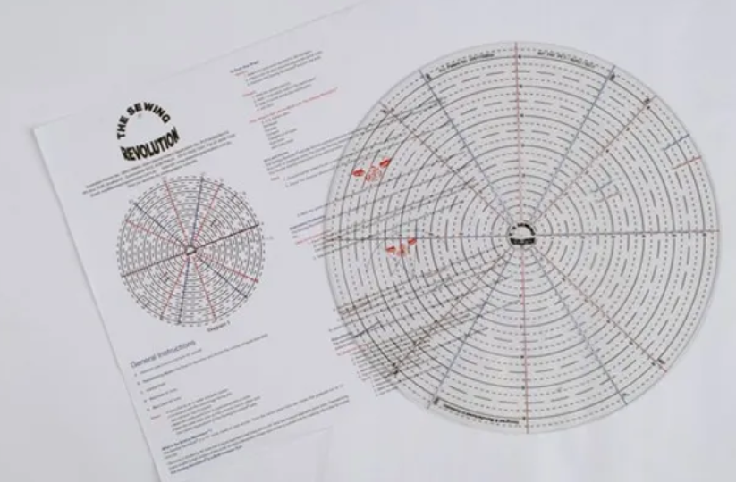 The Sewing Revolution 6/8 is a 13 inch circular ruler made of clear durable material. Circles graduate out at ¼” intervals from a central hole. The Circle is divided by 45º lines into 8 equal segments (red lines) and by 60º lines into 6 equal segments (blue lines). Repositioning holes enable further division of the circle into 12 or 16.