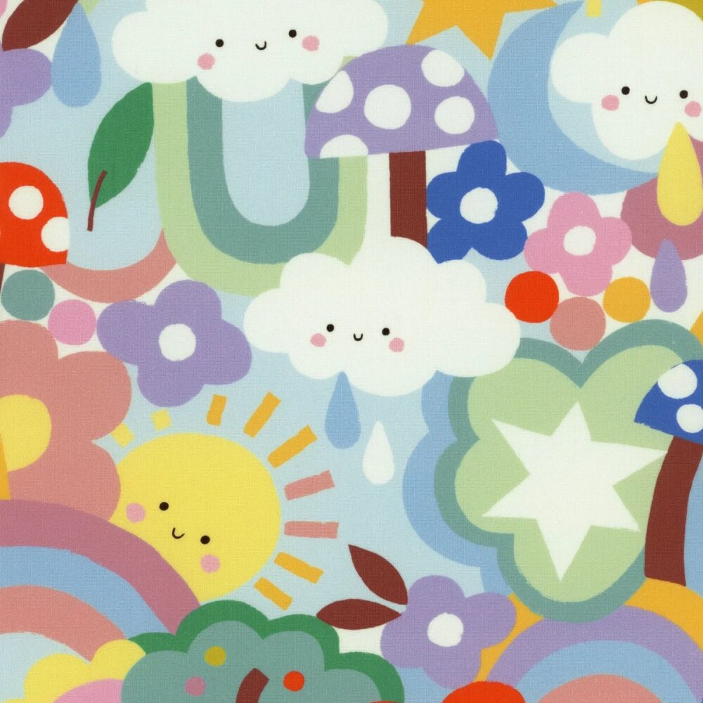 The Whatever the Weather fabric collection from Moda fabrics is the best way to get ready for sunny days ahead! Designed by Paper + Cloth, this collection features cute animals, rainbows, and sunshine in a bright and cheerful color palette. The retro-style prints will bring smiles to your face, while the clouds and raindrops add a touch of whimsy. Make an adorable quilt or pillow with this fabric featuring packed mushrooms, rain clouds, smiling suns, flowers, rain drops, and other fun shapes on a pale blue background.