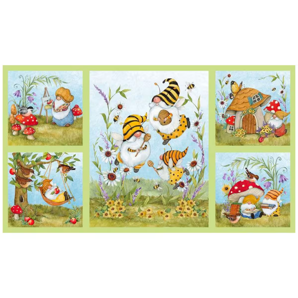 Experience a whimsical world of buzzing delight with the Buzzin’ With My Gnome-iezz fabric collection by Susan Winget from Wilmington Prints. This charming collection is filled with adorable gnomes, busy bees, delightful toadstools, and cheerful daisies. This panel depicts a scene of relaxed and playful gnomes, buzzing about in spring. Panel measures approximately 24″ x 44″.